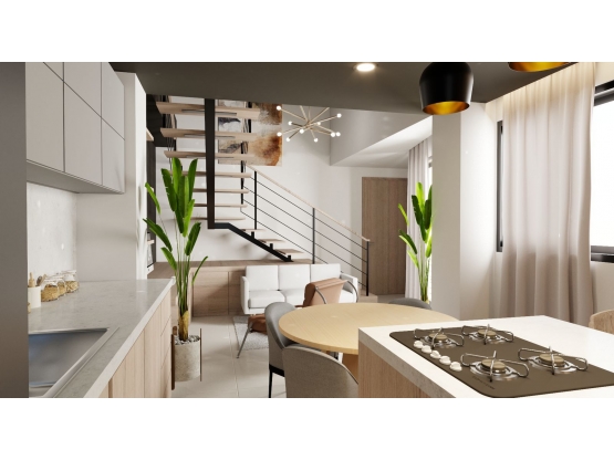 Área 53 m2, cuenta con en el primer nivel, cocina integral con concepto abierto y barra americana, sala comedor, zona de ropas independiente, medio baño social, piso en porcelanato, luces led empotradas y tiras led ambienbientales indirecta en zona zocial, video portero; En el segundo nivel una amplia alcoba con baño privado y vestier; El apartamento tiene doble altura, lo que permite apreciar un espacio mas amplio y ventilado; parqueadero privado para moto cubierto. Tercer piso, (imagienes de referencia). Es un apartamento pensado para quienes les gustan los espacios amplios, con buena iluminación, ventilados y con excelente ubicación. Entrega 30 de Mayo.