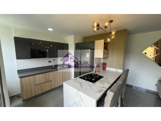 Apartamento de 60 m2 de área, 2 alcobas, la principal con baño privado con ducha con hidromasaje, mas un baño social, para un total de 2 baños completos, 1 estudio que se puede cerrar si lo prefieren como alcoba, sala comedor, cocina abierta a la sala con isla y cubierta en la isla que tambien sirve de barra o comedor, zona de ropas, balcón, cuarto útil y parqueadero.